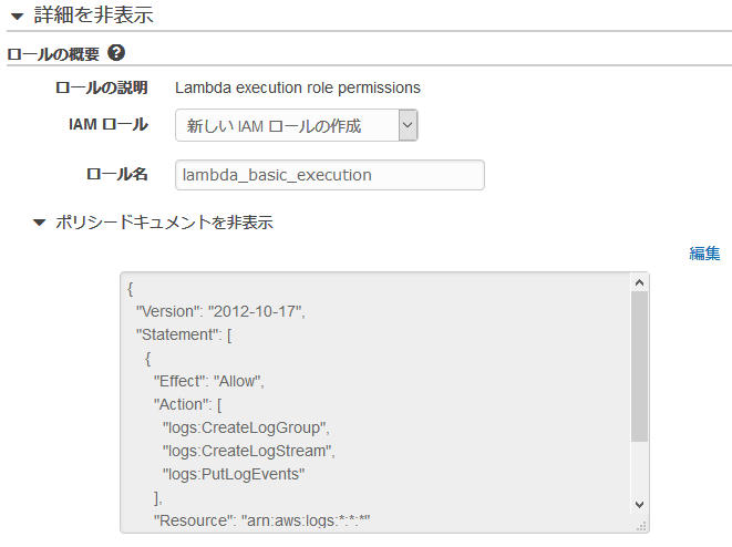 「カスタムロールの作成」を選択し、Lambda実行用のIAMロールを作成します。