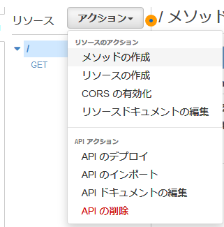 最後に「アクション」から「APIのデプロイ」を選択し、ステージを決定のうえデプロイ完了です。