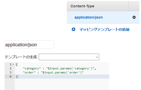 「統合リクエスト」を選択し、「本文マッピングテンプレート」→「マッピングテンプレートの追加」で以下を入力して保存します。