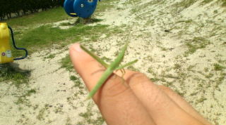 その後、霊園の上にある公園で妹と遊んでいると、バッタに遭遇。