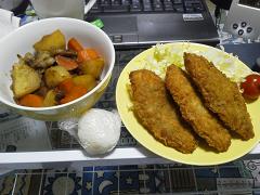そんな中、私は初めて肉じゃがをつくりました(左側)  右側のフライはスーパーで買い、また手前にあるのはおにぎりです。